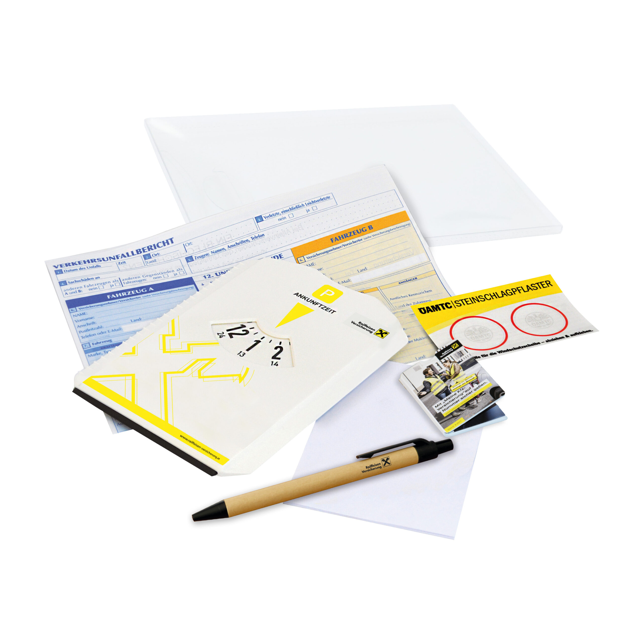 Diese Mappe (RPET) gehört in jedes Handschuhfach! Inhalt: 1 Parkscheibe mit Eiskratzer-Funktion, 1 Unfallbericht, 1 Carglass Steinschlag-Pickerl, 1 Mini-Block, 1 Kugelschreiber, 1 Soforthilfe-Faltmäppchen